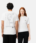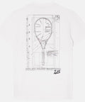 Imprimé grand format au dos inspiré d’un dessin technique de raquette de René Lacoste, signature évènementielle forte.